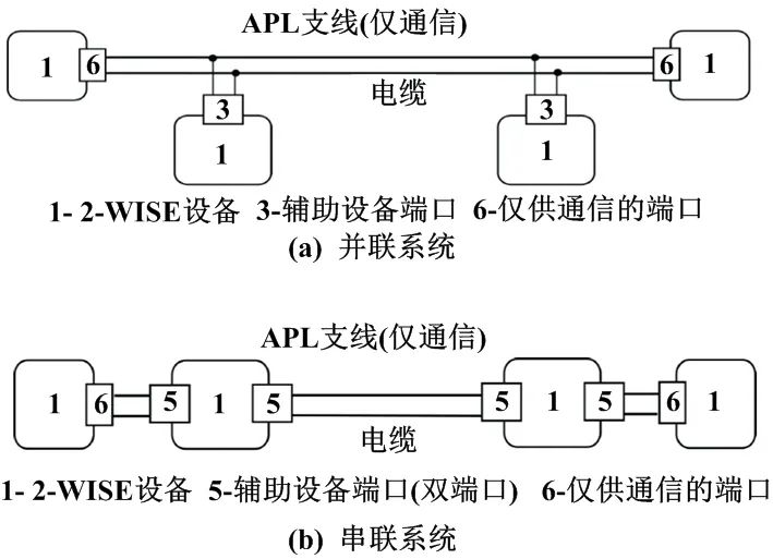 需要補充說明的是,圖3和圖4 中帶2個輔助端口的2-WISE設備所提供的2個端口在電氣上是連通的,只是物理上為了便于連接而設置了2組端口。因此,其本質上是1個端口。