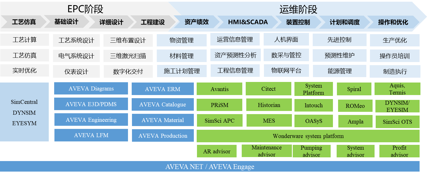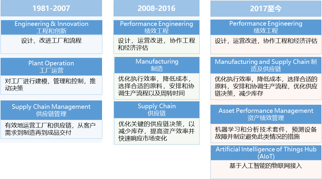 施耐德于2014年收購(gòu)英維斯(Invesys),2017 年反向收購(gòu)劍維,并將英維斯的業(yè)務(wù)與劍維整合。原來(lái)英維斯的軟件,包括用于化工流程模擬的 PRO/II、用于換熱設(shè)備和網(wǎng)絡(luò)優(yōu)化的HEXTRAN、用于動(dòng)態(tài)過(guò)程模擬的 DYNSIM、用于在線實(shí)時(shí)優(yōu)化的ROMeo等,現(xiàn)在都集成在劍維品牌下,形成了工程設(shè)計(jì)集成平臺(tái)AVEVA E3D、IE&D、流程模擬平臺(tái)軟件、資產(chǎn)績(jī)效管理套件,提供從工程設(shè)計(jì)、工程建設(shè)、數(shù)字化交付到生產(chǎn)運(yùn)營(yíng)全生命周期的解決方案,如圖 4 所示。