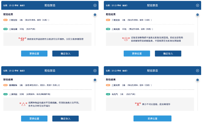 系統根據危化品理化性質,提示配伍禁忌,避免不相容的危化品混放混存,極大降低安全風險。