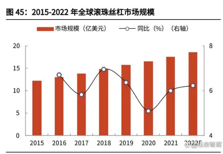 從市場空間來看,全球滾珠絲杠市場規(guī)模穩(wěn)健增長,中國已成為最重要的消費市 場之一,長期成長空間可觀。根據(jù)秦川機(jī)床公告,2016-2021 年全球滾珠絲杠市 場規(guī)模從 13.1 億美元增長至17.5 億美元;同期我國滾珠絲杠市場規(guī)模從 16.8 億元增長至25.6 億元。中國已成為滾珠絲杠產(chǎn)品重要的消費市場之一,約占全 球規(guī)模總量的 20%左右。從市場競爭格局看,目前全球主要的滾珠絲杠廠商有 NSK、THK、SKF 等,根 據(jù)華經(jīng)產(chǎn)業(yè)研究院統(tǒng)計,2021 年 CR5 銷售額市占率達(dá)到約 46%,其中主要來自 歐洲和日本,日本和歐洲滾珠絲杠企業(yè)占據(jù)了全球約 70%的市場份額。