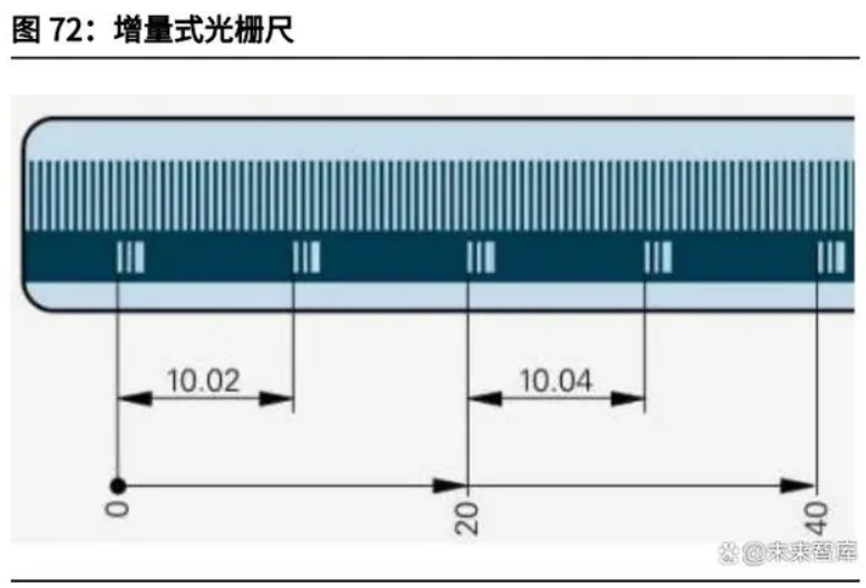 光柵尺是光柵線位移傳感器的簡稱,是一種利用光柵原理實現(xiàn)線位移測量的傳感 器。光柵線位移傳感器主要應(yīng)用于直線移動導(dǎo)軌機(jī)構(gòu),可實現(xiàn)移動量的精確顯示 和自動控制,廣泛應(yīng)用于金屬切削機(jī)床加工量的數(shù)字顯示和 CNC 加工中心位置 環(huán)的控制。按照材質(zhì)不同,可分為玻璃光柵和鋼光柵;按照測量原理可分為絕對式和增量式;按照掃描方式可分為成像掃描和干涉掃描;按照防護(hù)性能不同,可分為封閉式光 柵尺和開放式光柵尺。從產(chǎn)品類型及技術(shù)方面來看,目前增量式光柵尺由于較低的成本和技術(shù)要求,占 有超過 80%的份額。預(yù)計未來幾年,絕對式光柵尺將保持更快的增長速度。