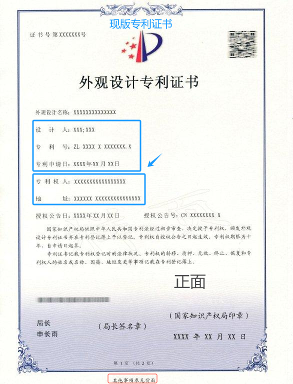 (新版外觀設(shè)計專利證書和現(xiàn)版外觀設(shè)計專利證書)