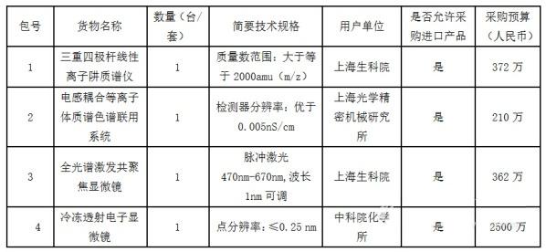 日前,中國政府采購網發布中國科學院各研究所中國科學院2017年儀器設備部門集中采購項目(第二批)公開招標公告,上海生科院、上海光學精密機械研究所、中科院化學所等單位集中采購4臺/套儀器設備,包括三重四極桿線性離子阱質譜儀、電感耦合等離子體質譜色譜聯用系統、全光譜激發共聚焦顯微鏡、冷凍透射電子顯微鏡,預算3444.0 萬元,開標時間:2017年10月19日 09:30。