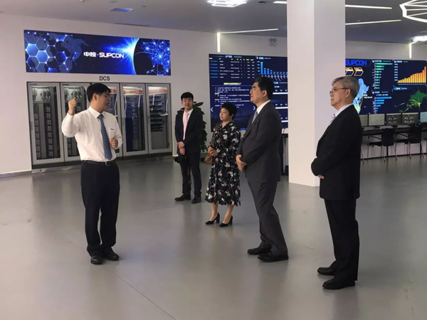 簽約儀式當天,黃文生董事長一行在中控相關領導陪同下共同參觀了中控科技體驗中心,過程中,褚健、賈勛慧向黃文生董事長一行詳細介紹了中控的發展歷程、產品體系,以及中控在工業4.0、智能制造、工業互聯網等領域取得的進展與成果。