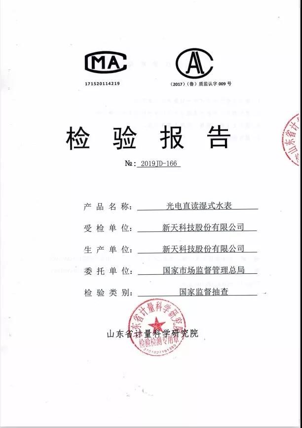 2019年10月,新天科技水表產(chǎn)品再次順利通過國家市場監(jiān)督管理總局質(zhì)量監(jiān)督抽查,榮獲國家《檢驗報告》合格證書。