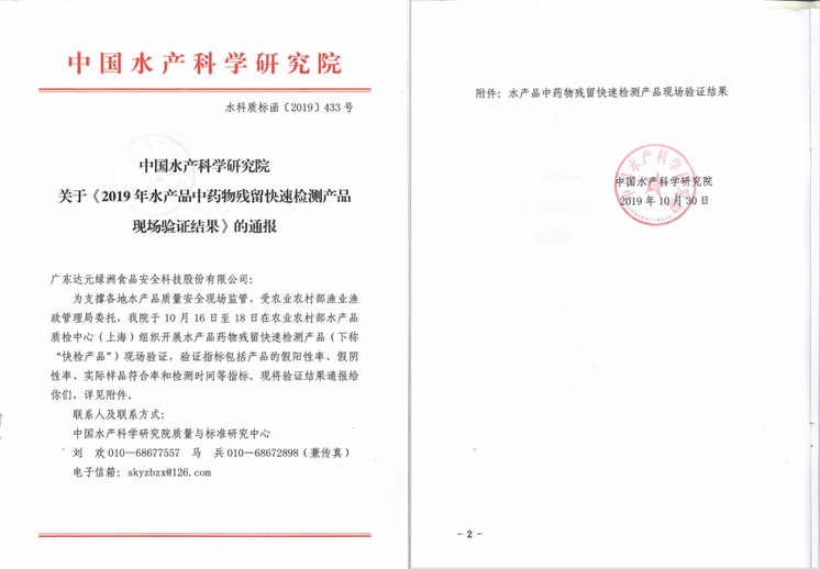 食安科技產品通過農業農村部2019年水產品中藥物殘