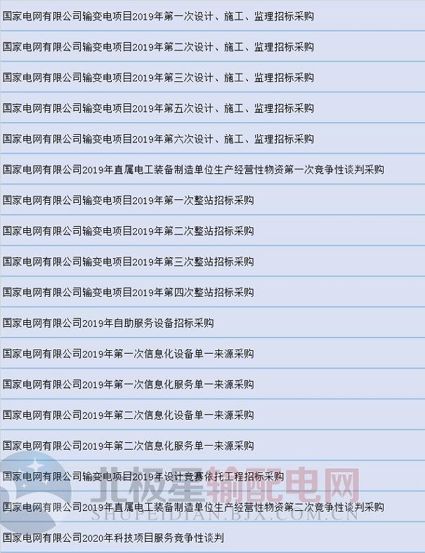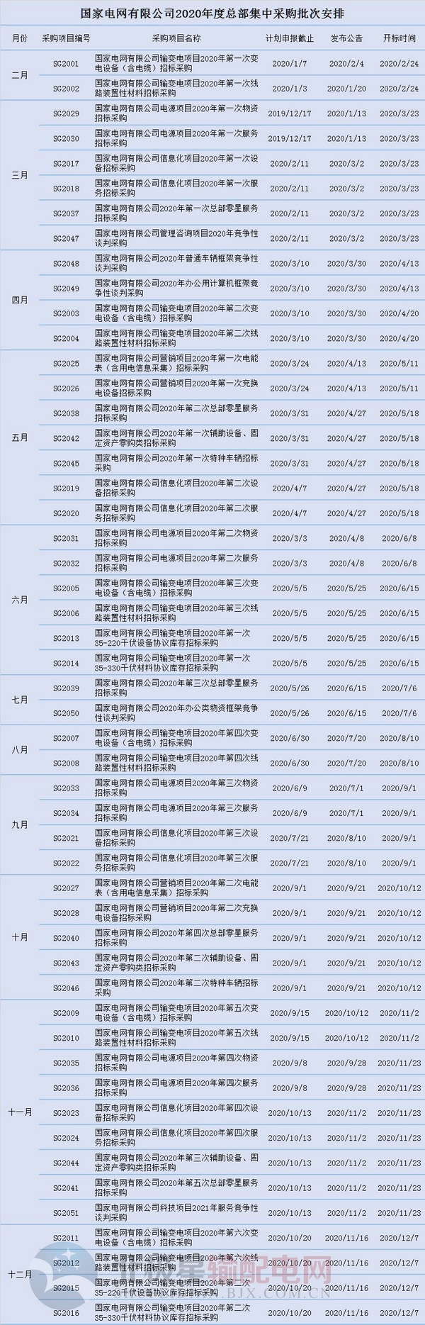 首先比較明顯的一點(diǎn)是2019年12月份未安排有招標(biāo)計(jì)劃,最早一批招標(biāo)計(jì)劃發(fā)布時(shí)間在2月份,為“國(guó)家電網(wǎng)有限公司輸變電項(xiàng)目2020年第一次變電設(shè)備(含電纜)招標(biāo)采購(gòu)”。此外,2020年度招標(biāo)計(jì)劃中整個(gè)招標(biāo)項(xiàng)目減少了近18個(gè)項(xiàng)目,包括了設(shè)計(jì)施工監(jiān)理招標(biāo)、電工裝備制造單位生產(chǎn)經(jīng)營(yíng)性物資競(jìng)價(jià)招標(biāo)、變電站整站招標(biāo)以及信息化單一來(lái)源招標(biāo)等。未有變化招標(biāo)項(xiàng)目依然包括了“輸變電項(xiàng)目變電設(shè)備類招標(biāo)”、電能表類招標(biāo)以及信息化設(shè)備和服務(wù)招標(biāo)等。