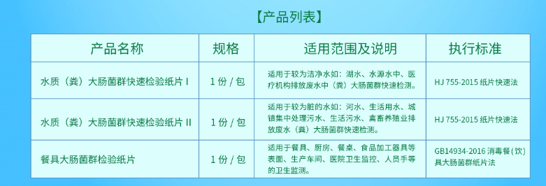 廣東達元綠洲食品安全科技股份有限公司(簡稱“食安科技”)專注于微生物快速檢測領域技術研發多年,并參與中華人民共和國國家環境保護標準HJ755-2015《水質總大腸菌群和糞大腸菌群的測定紙片快速法》標準制定。針對水質(糞)大腸菌群快速檢測,食安科技率先推出符合環境保護部HJ755-2015《水質總大腸菌群和糞大腸菌群的測定紙片快速法》標準的快速檢測產品,該產品無需配置培養基,直接取水樣加到紙片上,培養18~24小時即可出結果,靈敏度可達20 MPN/L,非專業人員通過簡單培訓即可進行檢測,非常適合基層檢測單位使用。可幫助環境監測單位、污水處理廠、醫院、水生產企業、集中式供水水質檢測、環保企業等單位,快速高效地開展地表水(如湖水、水源水、河水、生活用水等)以及廢水(生活污水、醫療機構處理后排放污水、工業處理后排放污水、畜牧養殖業業等排放的廢水)中的大腸菌群和糞大腸菌群的快速檢測。