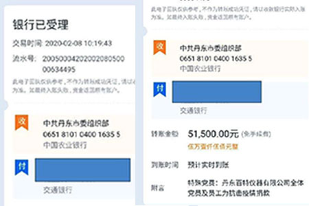 2月8日上午,丹東百特黨支部將凝聚著33名黨員和136名員工拳拳愛國之心的51500元的特殊黨費匯到中共丹東市委組織部。市委組織部領導稱贊百特是“愛黨愛國的典范,抗擊疫情的榜樣”。