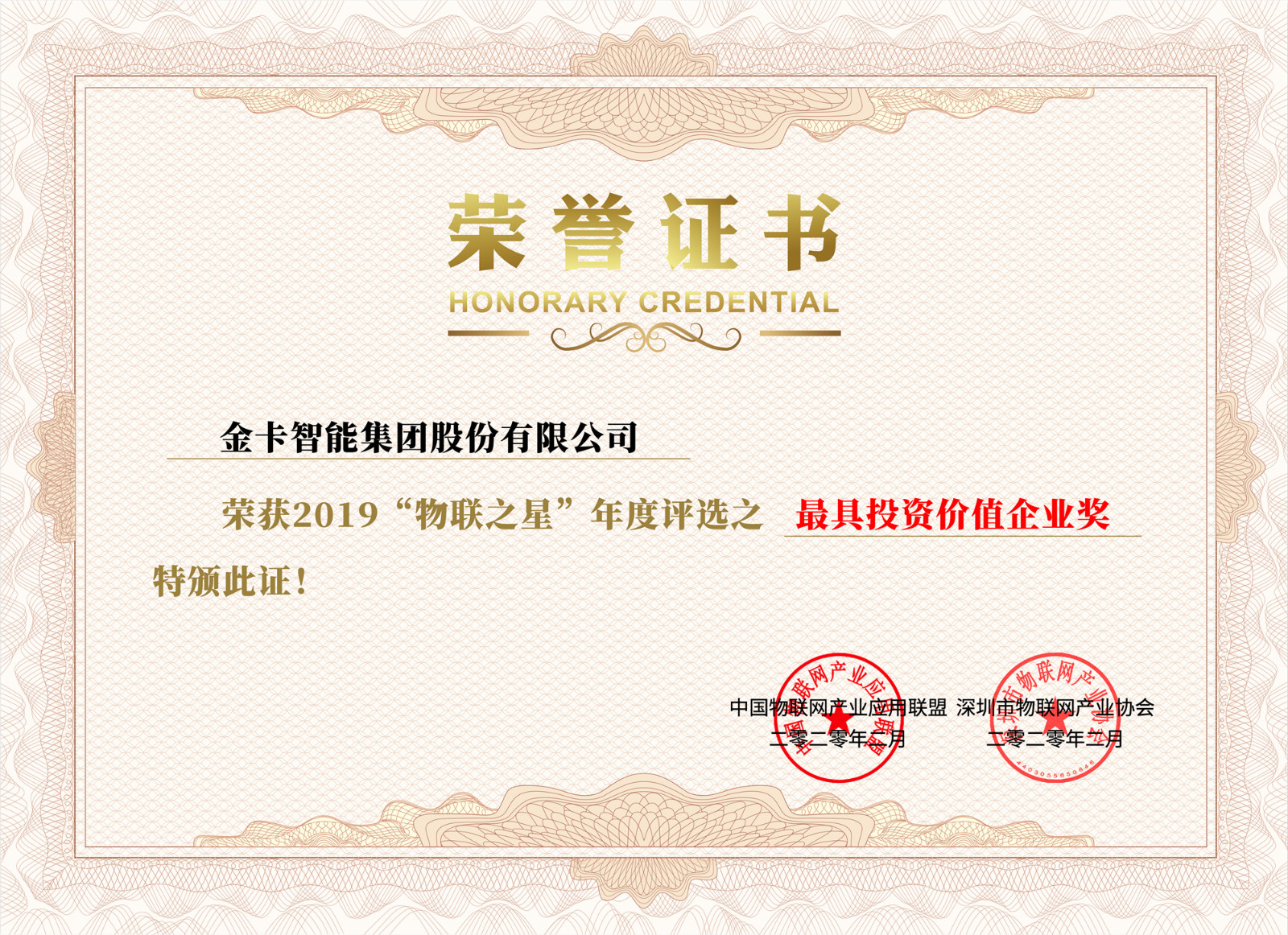 2月25日,由中國物聯網產業應用聯盟、深圳市物聯網產業協會主辦、物聯傳媒承辦的2019物聯之星中國物聯網行業年度評選落下帷幕,金卡智能斬獲“最具投資企業獎”、“最有影響力物聯云平臺企業獎”、“最佳智慧能源應用方案獎”,楊斌董事長榮獲“年度卓越人物獎”,成為獲獎最多的企業之一。