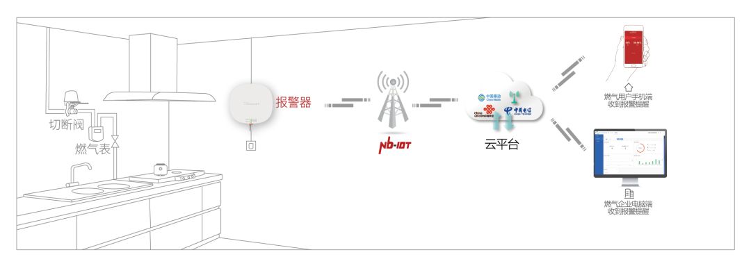 金卡智能NB-IoT天然氣報(bào)警器基于NB-IoT技術(shù)完成遠(yuǎn)程報(bào)警,一旦出現(xiàn)燃?xì)庑孤瑘?bào)警器及時(shí)將信息發(fā)送至燃?xì)馄髽I(yè)后臺(tái)及用戶手機(jī),及時(shí)掌控險(xiǎn)情狀況,同時(shí)自主聯(lián)動(dòng)燃?xì)獗怼C(jī)械手關(guān)閉閥門(mén),開(kāi)啟智能窗戶,打開(kāi)智能排風(fēng)扇等,降低危險(xiǎn)隱患。
