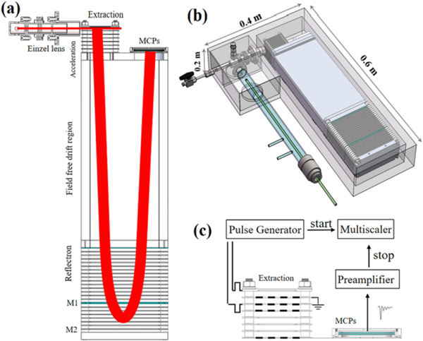 該團隊唐小鋒副研究員和溫作贏博士等人,以真空紫外放電燈作為電離源,自行設(shè)計和研制了小型真空紫外光電離反射式飛行時間質(zhì)譜儀,并將之應(yīng)用于大氣自由基反應(yīng)動力學研究。通過設(shè)計具有籠式結(jié)構(gòu)的新型聚焦電場,實現(xiàn)了電離區(qū)內(nèi)離子的高效率收集,提高了質(zhì)譜儀的檢測靈敏度(自由基靈敏度達到0.3ppb)。同時,通過采用垂直引入式結(jié)構(gòu)和二級空間聚焦等關(guān)鍵技術(shù),實現(xiàn)小型化質(zhì)譜儀高的質(zhì)譜分辨本領(lǐng)(M/△M = 2000, FWHM)。