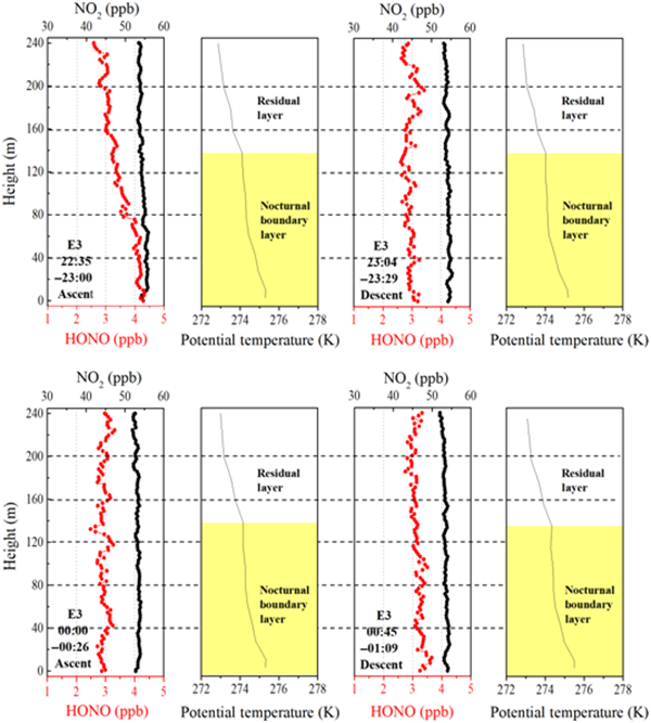 HONO作為OH自由基的重要前體物,其光解貢獻了日間25%–60%的OH自由基,在大氣光化學反應過程中扮演著重要作用。盡管對大氣HONO的研究已有幾十年的歷史,其詳細的形成機理仍存在爭議,夜間地表面和氣溶膠表面的HONO生成仍是研究的熱點之一。因此,針對北京市高霧霾污染狀況,開展夜間HONO垂直梯度研究,研究不同污染階段夜間地表面和氣溶膠表面的HONO生成,對了解夜間大氣HONO生成機制具有重要意義。