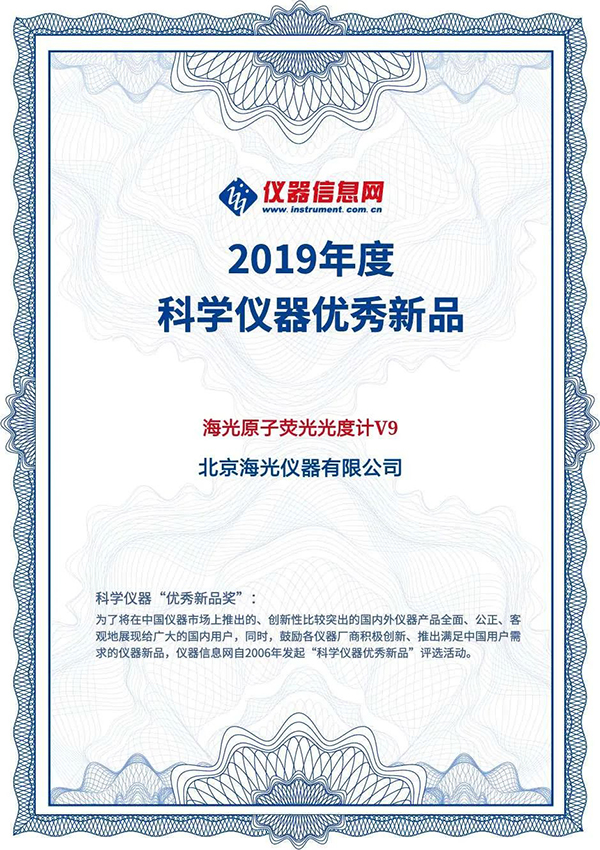 2020年5月20日,由儀器信息網(wǎng)主辦,“科學(xué)儀器優(yōu)秀新品”評審委員會、“新品首發(fā)”欄目承辦的科學(xué)儀器“優(yōu)秀新品獎”在線發(fā)布盛典盛大召開,2019年度科學(xué)儀器“優(yōu)秀新品獎”獲獎名單首次在云端揭曉,海光HGF-V9原子熒光光度計(jì)榮獲該獎項(xiàng)。