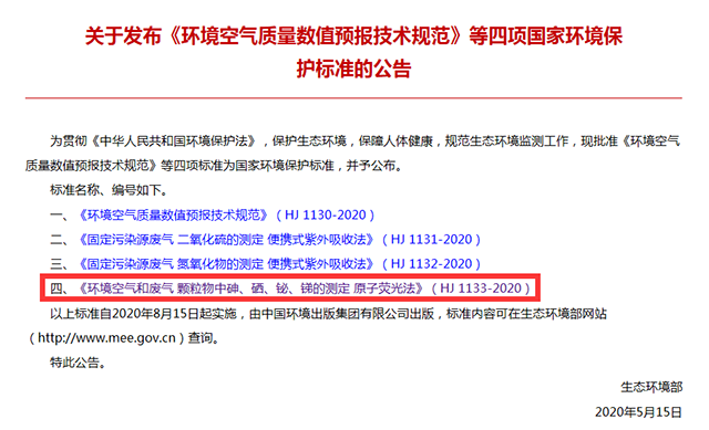 為貫徹《中華人民共和國環境保護法》和《中華人民共和國大氣污染防治法》,進一步完善國家生態環境保護標準體系,近日,生態環境部發布四項國家生態環境保護標準,其中《環境空氣和廢氣 顆粒物中砷、硒、 鉍、銻的測定 原子熒光法》(HJ 1133-2020),規范了環境空氣和廢氣顆粒物中砷、硒、鉍、銻的測定方法。該標準為首次發布,自2020年8月15日起實施。