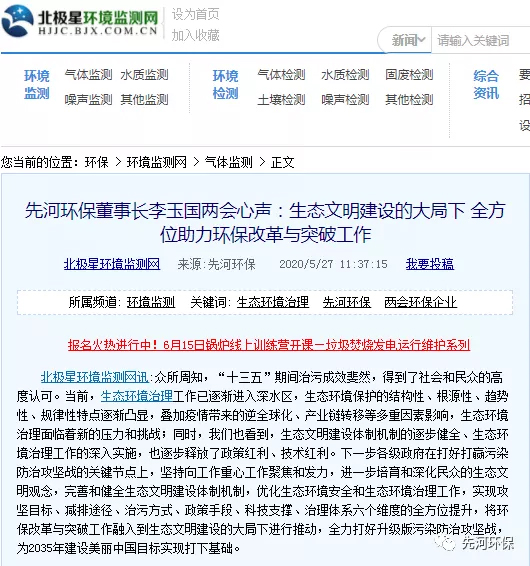 兩會(huì)期間,北極星環(huán)境監(jiān)測(cè)網(wǎng)特邀先河環(huán)保(股票代碼:300137)董事長(zhǎng)李玉國(guó)通過網(wǎng)絡(luò)媒體向“兩會(huì)”建言獻(xiàn)策。報(bào)道發(fā)出后,立即引發(fā)廣泛關(guān)注。