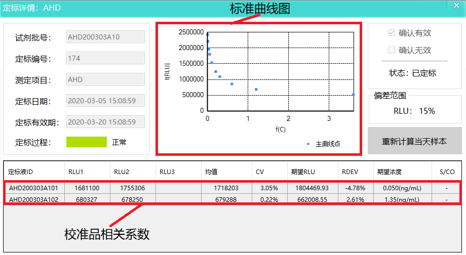 通過呋喃四項校準品發光值進行算法擬合出當天標準曲線, 校準品各詳細參數均在下圖中,校準品變異系數均小于5%。
