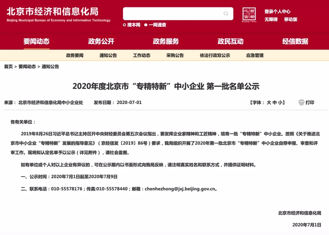 北京市開展“專精特新”企業培育工作,旨在促進中小企業轉型升級,提升中小企業綜合競爭力,培育一批在細分行業內技術實力強、產品質量好、服務水平優、市場份額高、品牌影響大、發展前景廣的中小企業。2020年第一批北京市“專精特新”中小企業評選綜合考察了企業的經營、技術和市場前景等條件。獲得“專精特新”稱號的中小企業,意味著其是市場中的佼佼者,是行業中創新能力強、掌握關鍵核心技術的領頭羊企業。