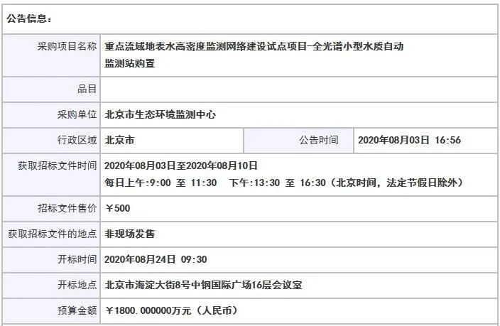 目前,中鋼招標有限責任公司受北京市生態(tài)環(huán)境監(jiān)測中心委托,正在對“重點流域地表水高密度監(jiān)測網(wǎng)絡建設試點項目-全光譜小型水質自動監(jiān)測站購置”項目進行公開招標。該項目總預算為1800萬元,要采購的儀器為30套全光譜小型水質自動監(jiān)測站。按照采購方要求,每套小型水質自動監(jiān)測站要包括全光譜分析儀、水質五參數(shù)傳感器以及氨氮在線分析模塊,可監(jiān)測分析水溫、pH、溶解氧、電導率、濁度、高錳酸鹽指數(shù)、化學需氧量、生化需氧量、總有機碳、氨氮、硝酸鹽氮、亞硝酸鹽氮參數(shù),具備流量監(jiān)測及配套設施等。