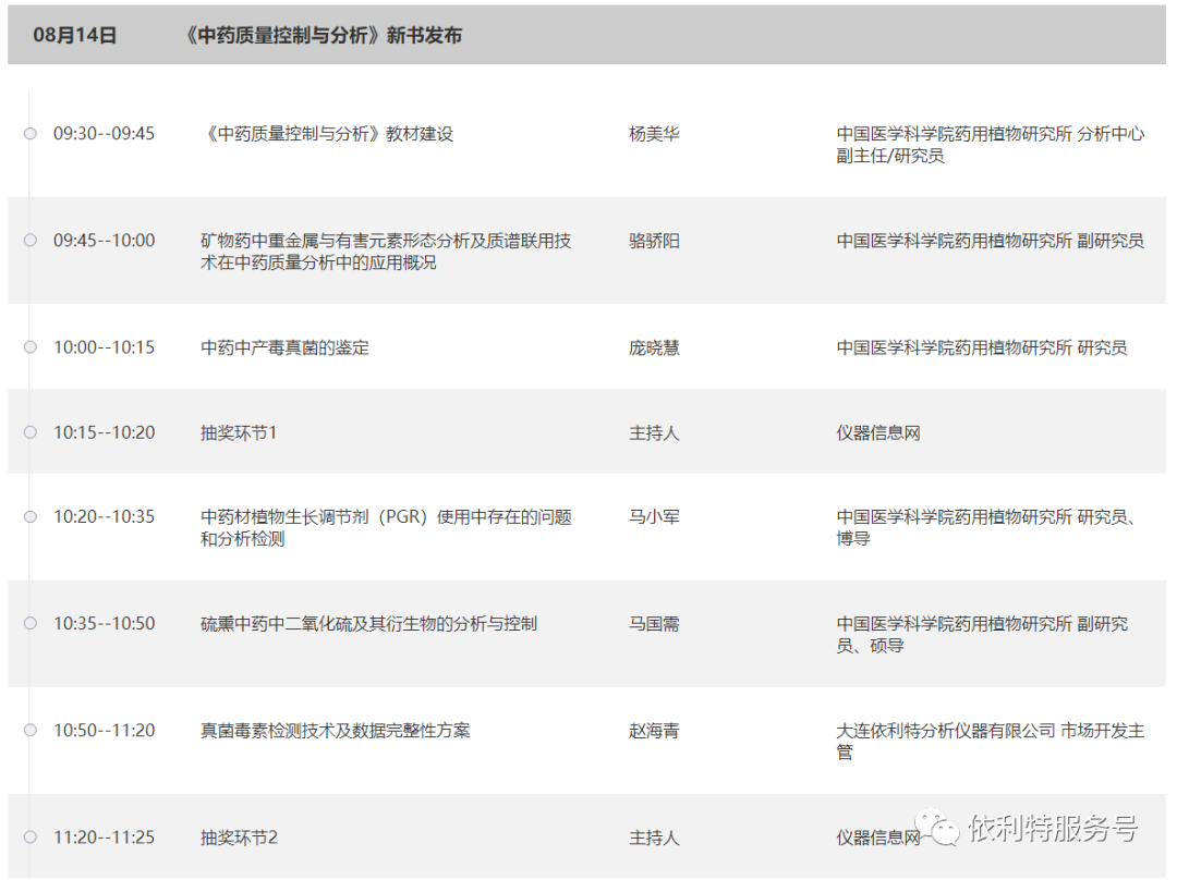 2、關(guān)注【依利特服務(wù)號(hào)】,獲得會(huì)后回放視頻、并有機(jī)會(huì)獲得《中藥質(zhì)量控制與分析》新書。