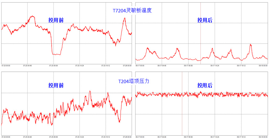 針對(duì)二甲酯裝置設(shè)計(jì)四大控制器:丙碳反應(yīng)及其精餾部分控制器、5萬(wàn)噸/年二甲酯精餾部分控制器、2.5萬(wàn)噸/年二甲酯精餾部分控制器、丙二醇精餾部分控制器。先進(jìn)控制系統(tǒng)投用后,控制器投運(yùn)率大于95%,工藝參數(shù)平均穩(wěn)定性提高50%以上,裝置操作頻次下降75%,大大降低了操作人員的勞動(dòng)強(qiáng)度,實(shí)現(xiàn)了二甲酯裝置的穩(wěn)定優(yōu)化運(yùn)行。