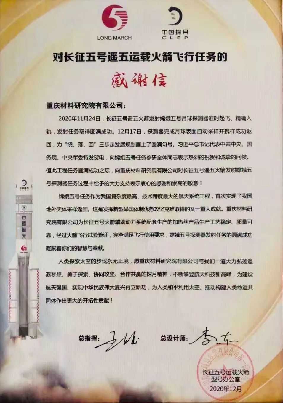 近日,重慶材料研究院有限公司(下簡(jiǎn)稱(chēng)“重材院”)收到了一封特別的感謝信,來(lái)自我國(guó)長(zhǎng)征五號(hào)運(yùn)載火箭型號(hào)辦公室。信中提到:“重材院加熱絲產(chǎn)品生產(chǎn)工藝穩(wěn)定、質(zhì)量可靠,經(jīng)過(guò)火箭飛行實(shí)驗(yàn)驗(yàn)證,完全滿足飛行使用要求。”