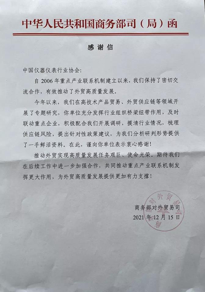 近日,工業(yè)和信息化部重大技術(shù)裝備辦公室、商務(wù)部對外貿(mào)易司向中國儀器儀表行業(yè)協(xié)會(huì)發(fā)來感謝信,對協(xié)會(huì)2021年在發(fā)揮行業(yè)組織橋梁紐帶作用、凝聚行業(yè)發(fā)展共識(shí)、反映行業(yè)運(yùn)行訴求、促進(jìn)行業(yè)健康發(fā)展、為相關(guān)部門提供信息支撐和決策參考等方面發(fā)揮的作用和開展的工作給予高度評(píng)價(jià),對協(xié)會(huì)積極配合部委工作給予的大力支持表示誠摯感謝。