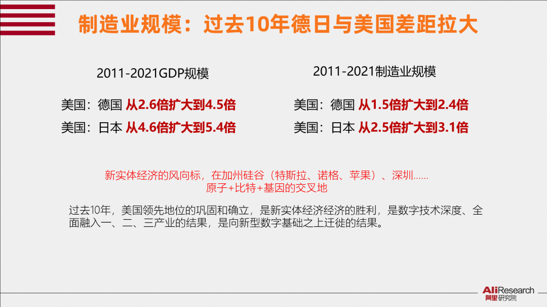 然而事實是,在過去的十年,德國、日本的GDP規(guī)模與美國的差距在拉大:從2011到2021年,美國GDP從相當(dāng)于德國的2.6倍擴(kuò)大到了4.5倍,相當(dāng)于日本的4.6倍擴(kuò)大到了5.4倍;更值的關(guān)注的是,就制造業(yè)而言,德國、日本的制造業(yè)規(guī)模與美國的差距仍在拉大:2011到2021年,美國制造業(yè)規(guī)模相當(dāng)于德國的1.5倍擴(kuò)大到2.4倍,相當(dāng)于日本的2.5倍擴(kuò)大到3.1倍。制造業(yè)領(lǐng)域美國正在涌現(xiàn)出一批具有全球競爭力的數(shù)字原生企業(yè),美國制造業(yè)仍然以比日本和德國更快的速度發(fā)展。