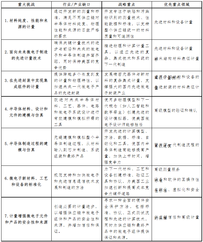 2022年9月的《美國半導(dǎo)體行業(yè)的戰(zhàn)略機遇》報告中,確定了從計量學(xué)角度需要重點關(guān)注的7大挑戰(zhàn),以實現(xiàn)美國領(lǐng)導(dǎo)的全球半導(dǎo)體行業(yè)的未來國家愿景。到2022年11月,芯片研發(fā)計量計劃將其投資組合進一步細化為10個優(yōu)先重點領(lǐng)域,以解決最關(guān)鍵的計量研發(fā)缺口。七大挑戰(zhàn)及對應(yīng)優(yōu)先重點領(lǐng)域如下: