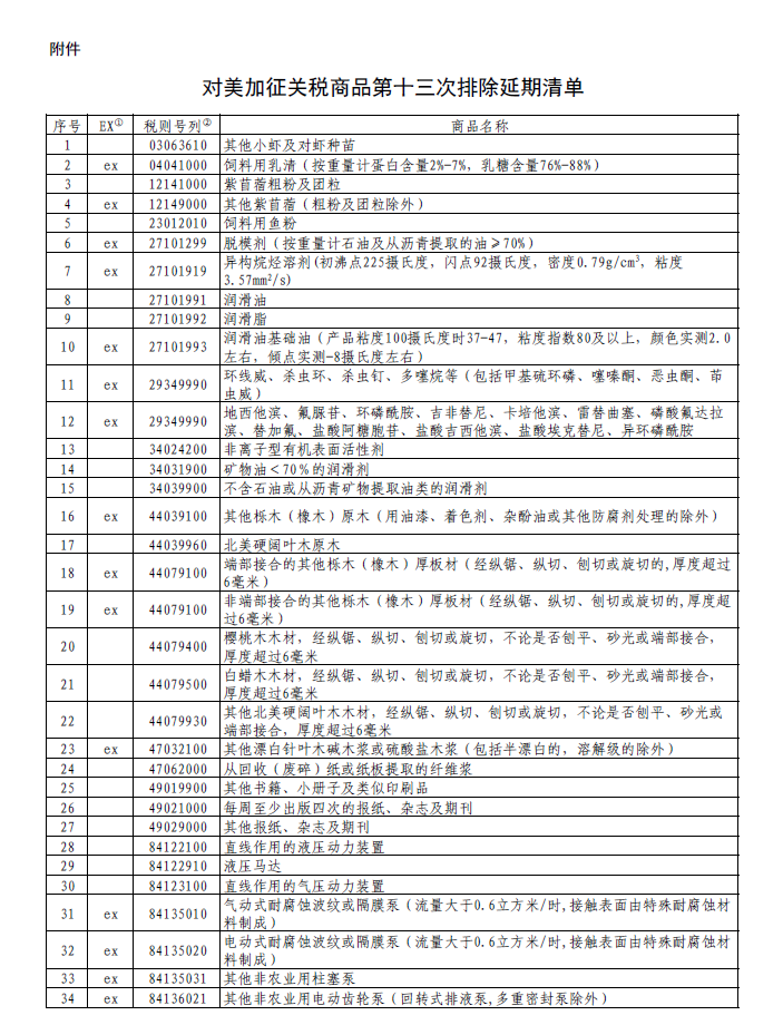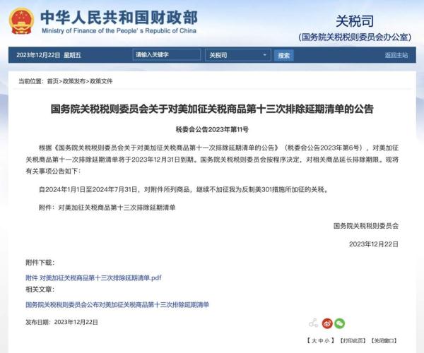 經(jīng)國務院批準,國務院關(guān)稅稅則委員會公布對美加征關(guān)稅商品第十三次排除延期清單,對《國務院關(guān)稅稅則委員會關(guān)于對美加征關(guān)稅商品第十一次排除延期清單的公告》(稅委會公告2023年第6號)中的相關(guān)商品,延長排除期限,自2024年1月1日至2024年7月31日,繼續(xù)不加征我為反制美301措施所加征的關(guān)稅。