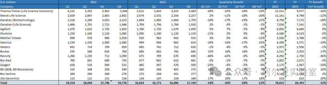 筆者對上市的生命科學(xué)的跨國公司做了一個不完全統(tǒng)計,總共挑選了16家公司,對于某些綜合性的公司,例如賽默飛、丹納赫、默克等,筆者挑出了生命科學(xué)相關(guān)的業(yè)務(wù),盡量去除比如診斷、制藥、化工等業(yè)務(wù)的影響。當(dāng)然,這其中不可避免混雜了其他非生命科學(xué)的業(yè)務(wù),例如凱杰和伯樂的診斷業(yè)務(wù)等,因為數(shù)字較小,故沒有進行剔除。默克因為要在3月初公布業(yè)績,所以這里的四季度的數(shù)據(jù)為筆者的估計。