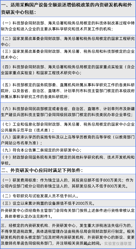 《辦法》明確提出:為鼓勵(lì)科學(xué)研究和技術(shù)開發(fā),促進(jìn)科技進(jìn)步,在2027年12月31日前,繼續(xù)對(duì)內(nèi)資研發(fā)機(jī)構(gòu)和外資研發(fā)中心采購國(guó)產(chǎn)設(shè)備全額退還增值稅。