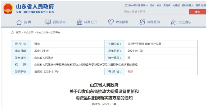 4月8日,《山東省人民政府關于印發山東省推動大規模設備更新和消費品以舊換新實施方案的通知》對外發布。