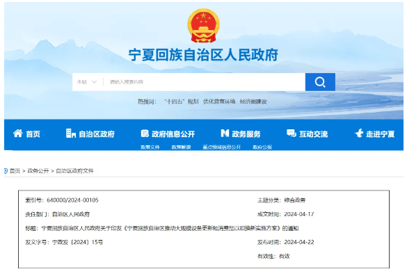 寧夏回族自治區(qū)推動大規(guī)模設備更新和消費品以舊換新實施方案