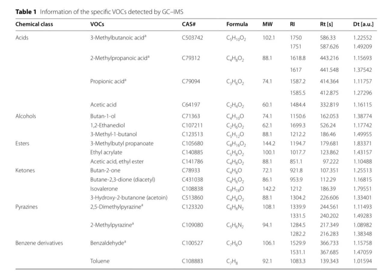 經過細菌培養和檢測,總共檢測出54VOCs(其中6VOCs同時檢測到單體和二聚體),包括4種有機酸、3種醇、3種酯、4種酮、2種吡嗪、2種苯衍生物和30種未定性VOCs。可定性VOCs詳見表 1,同時發現KP在培養5h后達到指數生長期的終點,后續時間點其VOCs的變化不明顯,因此相應的研究實驗均在5hT2)時間點開展。