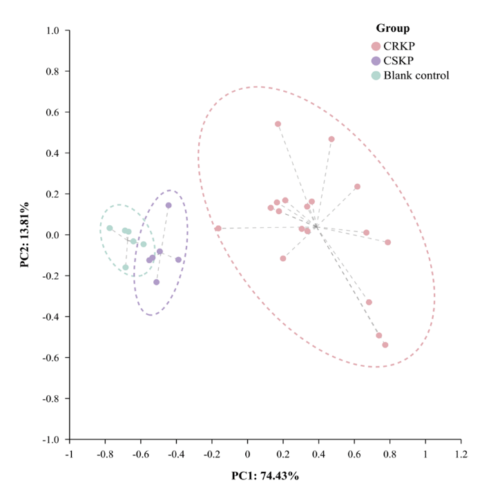 CRKPCSKP的鑒定中,在不添加IPM的條件下,通過檢測標準菌株的VOCs,發現5VOCs在兩個組別種存在顯著性差異,相對于CSKPCRKP的未定性物質3#21#28#和正丁醇含量增加,而未定性物質30#含量減少(圖 3)。之后主成分分析顯示上述5VOCs可有效地區分CSKPCRKP(圖 4),但這一差異會隨著時間推移而消失。