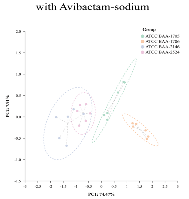 CRKP中,最為常見的是產CBPMKP,為研究VOCs的檢測是否有助于鑒定產CBPMCRKP,在標準菌株中加入IPM的同時,分別設置加入/不加入CBPM抑制劑進行對照研究,并在后續的時間點觀察VOCs的變化情況。以產A類碳青霉烯酶KP為例,結果表明,ATCC BAA-1705菌株在加入CBPM抑制劑后,和未加入CBPM抑制劑相比,出現了5VOCs(苯甲醛二聚體、2,5-二甲基吡嗪二聚體、2-甲基吡嗪二聚體、丁酮和未定性VOCs15#)含量的上升以及13VOCs2-甲基丙烯酸單體和二聚體、丙酸單體和二聚體、乙酸、3-羥基-2-丁酮和7種未定性物質)含量的下降(圖 6)。通過PCA分析顯示CBPM抑制劑的加入可鑒定ATCC BAA-1705A類產CBPMCRKP(圖 7)。與之相似的是,加入CBMP抑制劑后,產B類碳青霉烯酶KPATCC BAA-2146)的VOCs發生了特異性改變。