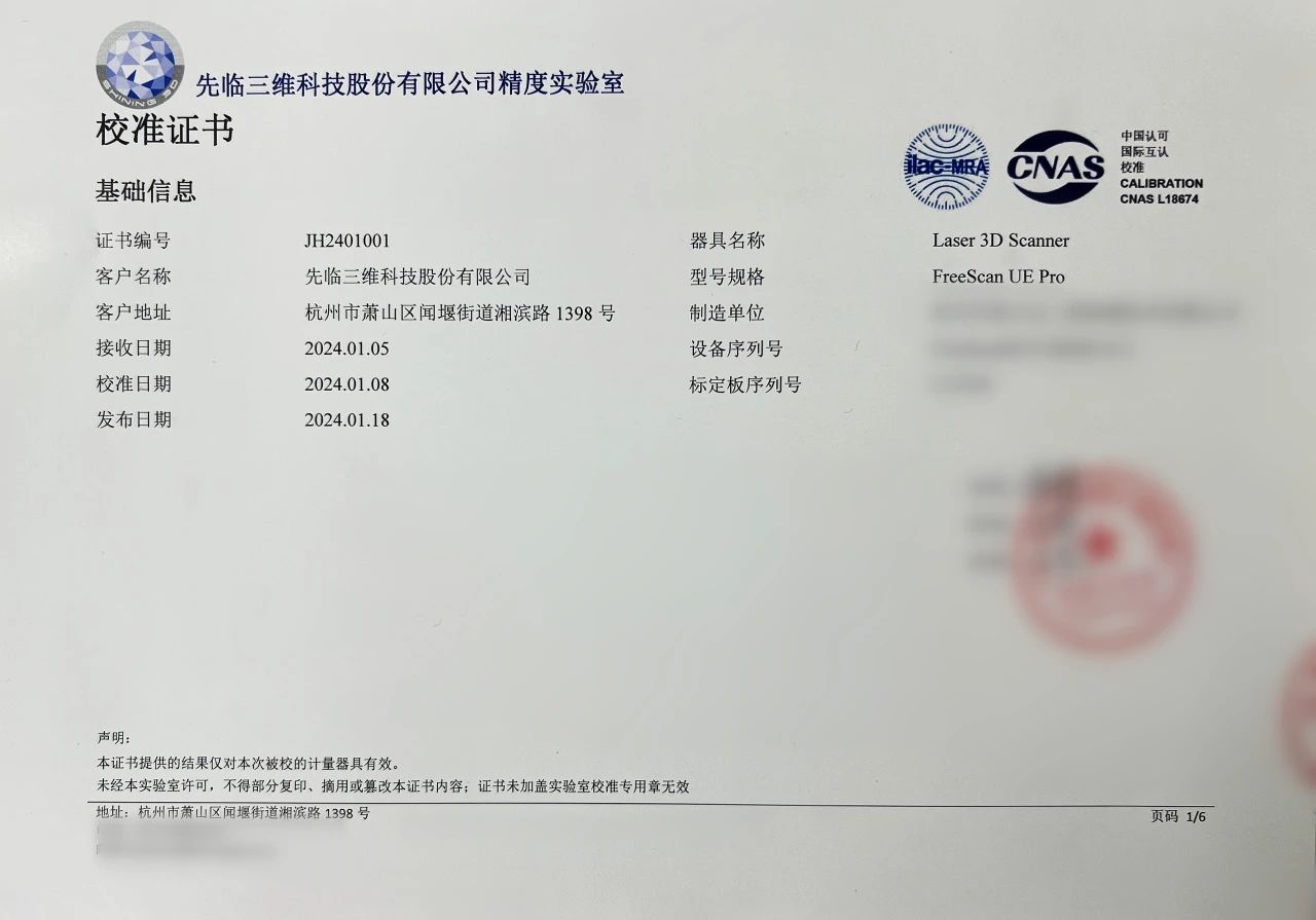 先臨三維作為業內的頭部企業之一,在設備精度的把控上,也是從研發、生產到檢驗端,都做了大量的工作。先臨參加起草了JJF 1951-2021《基于結構光掃描的光學三維測量系統校準規范》,在精度的把控上擁有完善的規程和體系。