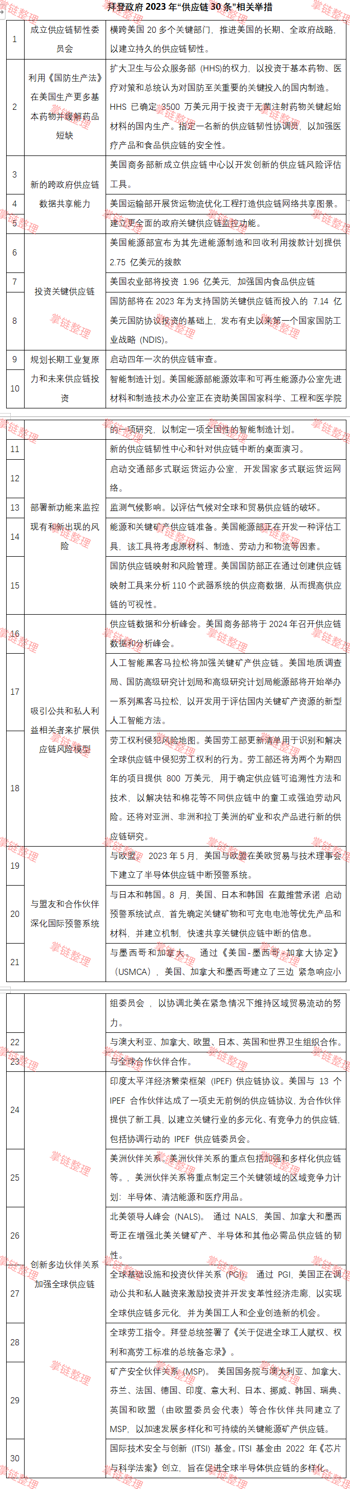 在2023年11月27日,拜登倉促宣布成立白宮供應鏈韌性委員會,同時推出“供應鏈30條”將所有的提升供應鏈穩定性措施串聯起來。這些行動涵蓋各種舉措,包括成立供應鏈韌性委員會、利用《國防生產法》促進對國內基本藥物生產的投資以緩解藥品短缺、實施新的跨政府供應鏈數據共享能力,以及促進更容易獲得更實惠、更可靠和關鍵的供應鏈技術。