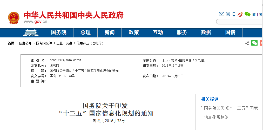 ⚪2016年,《十三五國家信息化規劃》出臺,提出網絡安全和信息化是一體之兩翼、驅動之雙輪的總要求,各地開始部署現代信息技術產業生態體系。