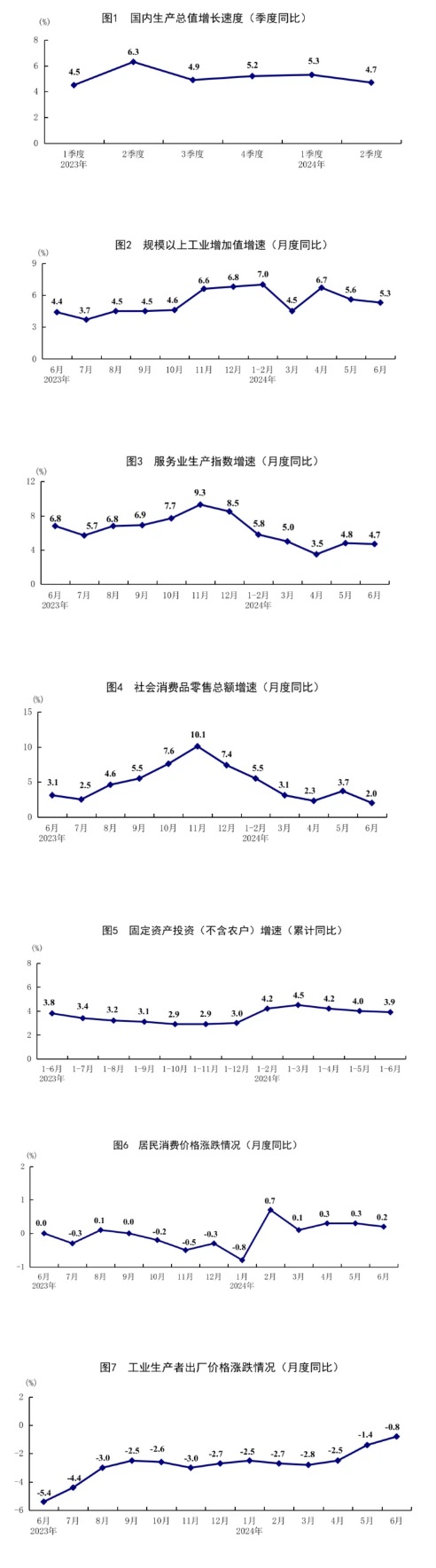 2023年各季度及2024年一季度、二季度GDP環比增速分別為1.8%、0.8%、1.5%、1.2%、1.5%和0.7%。
