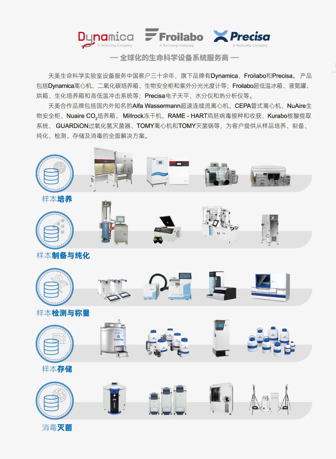 天美生命科學(xué)實(shí)驗(yàn)室設(shè)備服務(wù)中國(guó)客戶三十余年,旗下品牌有Dynamica、Froilabo 和 Precisa。產(chǎn)品包括Dynamica離心機(jī)、二氧化碳培養(yǎng)箱、生物安全柜和紫外分光光度計(jì)等;Froilabo超低溫冰箱、液氮罐、烘箱、生化培養(yǎng)箱和高低溫沖擊系統(tǒng)等;Precisa電子天平、水分儀和熱分析儀等。