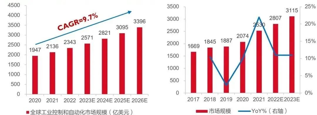 左圖:2020-2026E全球工控和自動化市場規模(億美元)