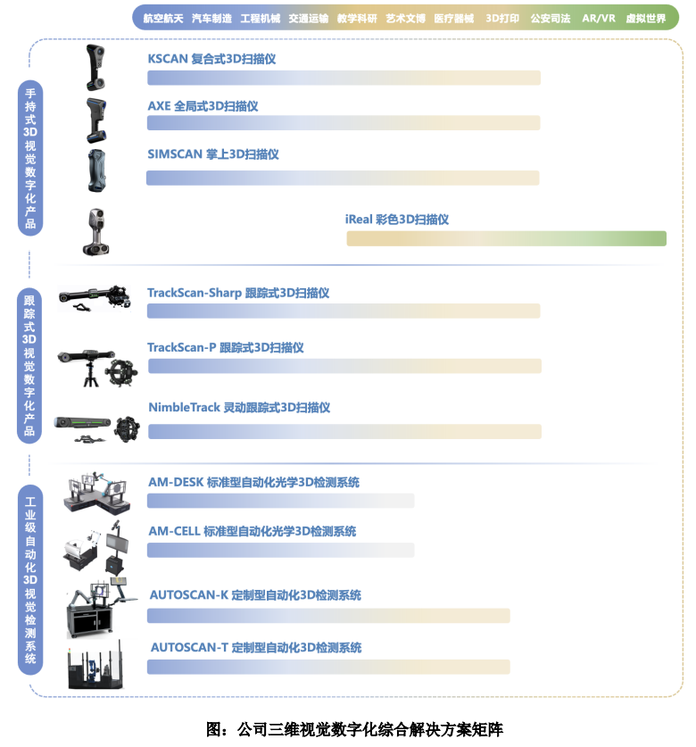 思看科技成立于2015年,公司控股股東和實(shí)際控制人均為王江峰、陳尚儉、鄭俊。公司是面向全球的三維視覺(jué)數(shù)字化綜合解決方案提供商,主營(yíng)業(yè)務(wù)為三維視覺(jué)數(shù)字化產(chǎn)品及系統(tǒng)的研發(fā)、生產(chǎn)和銷售。公司深耕三維視覺(jué)數(shù)字化軟硬件專業(yè)領(lǐng)域多年,逐步在關(guān)鍵光學(xué)部件、核心3D視覺(jué)算法、高性能硬件結(jié)構(gòu)設(shè)計(jì)、3D掃描及分析對(duì)比軟件等主要方面積累了豐富的技術(shù)能力,搭建起較為完善的三維視覺(jué)數(shù)字化技術(shù)平臺(tái),并基于此不斷開(kāi)發(fā)適應(yīng)領(lǐng)域廣泛、通用性強(qiáng)的創(chuàng)新產(chǎn)品。目前公司產(chǎn)品主要覆蓋工業(yè)級(jí)和專業(yè)級(jí)兩大差異化賽道,涵蓋便攜式3D視覺(jué)數(shù)字化產(chǎn)品、跟蹤式3D視覺(jué)數(shù)字化產(chǎn)品、專業(yè)級(jí)彩色3D視覺(jué)數(shù)字化產(chǎn)品和工業(yè)級(jí)自動(dòng)化3D視覺(jué)檢測(cè)系統(tǒng)等產(chǎn)品。