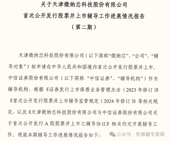 2024年1月19日,中信證券與微納芯簽署了輔導(dǎo)協(xié)議并于同日正式向中國(guó)證券監(jiān)督管理委員會(huì)天津監(jiān)管局(簡(jiǎn)稱“天津證監(jiān)局”)報(bào)送輔導(dǎo)備案申請(qǐng)材料;2024年1月22日,天津證監(jiān)局同意微納芯輔導(dǎo)備案并出具輔導(dǎo)備案登記確認(rèn)書(shū)。2024年4月12日,中信證券向天津證監(jiān)局報(bào)送關(guān)于天津微納芯科技股份有限公司首次公開(kāi)發(fā)行股票并上市輔導(dǎo)工作進(jìn)展情況報(bào)告(第一期)。2024年7月10日,中信證券向天津證監(jiān)局報(bào)送關(guān)于天津微納芯科技股份有限公司首次公開(kāi)發(fā)行股票并上市輔導(dǎo)工作進(jìn)展情況報(bào)告(第二期)。截至目前,中信證券對(duì)微納芯的上市輔導(dǎo)工作仍在進(jìn)行中。