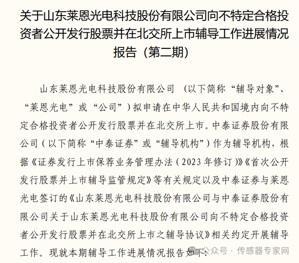 2023年12月,萊恩光電與中泰證券簽署上市輔導(dǎo)協(xié)議,截止2024年7月8日,已完成第二期輔導(dǎo)工作。