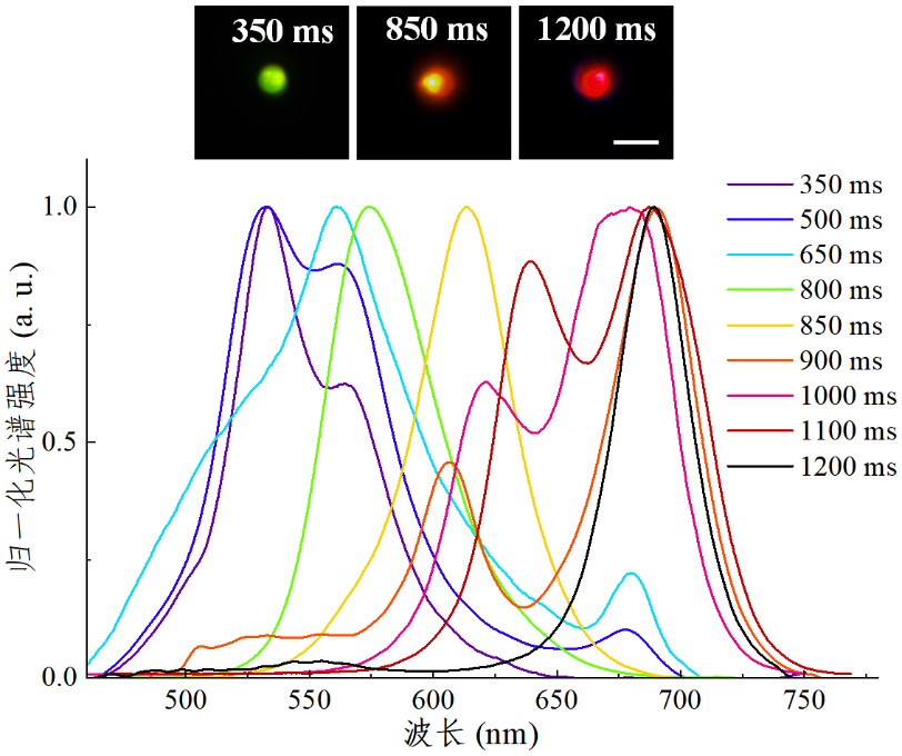 圖3(d)中綠色發光CsPbBr3納米晶和黃色CsPb(Br1−xIx)3納米晶線條組成的“鳥”圖案。在Br-Cl共摻的玻璃中,利用激光直寫出了綠色CsPbBr3納米晶和藍色 CsPb(Br1−xClx)3納米晶軌跡線組成的“鳥”圖案。在Cl-Br-I三種鹵素共摻的玻璃中展示了全彩色的“蝴蝶”圖案直寫(圖3)。除二維圖案外,利用納米位移平臺在玻璃內部的精度定位和移動,還實現了三維空間內微米“螺旋線”的直寫,展示該技術方案鈣鈦礦材料在三維圖案化方面的巨大潛力。