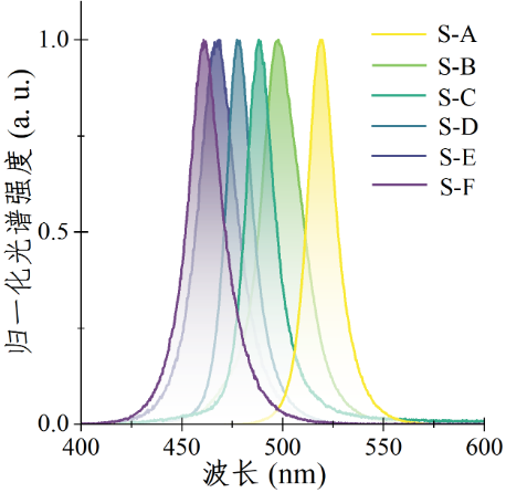 除A位鹵素陰離子帶隙可控的納米晶直寫外,研究人員在B位Cd/Pb陽離子體系證明了該方法可以調控玻璃中局部的納米液相分離和離子交換過程,并有效的控制元素的重新分布并調控局部化學成分。通過優化脈沖持續時間、重復頻率和脈沖能量以及玻璃組分中Cd/Pb的比例,在含銫、鉛、鎘和鹵化物元素的硼硅酸鹽玻璃中實現了超快激光誘導CsPbxCd1-xBr3納米晶析出,其發光波長可調范圍為461 nm~514 nm(圖2)。