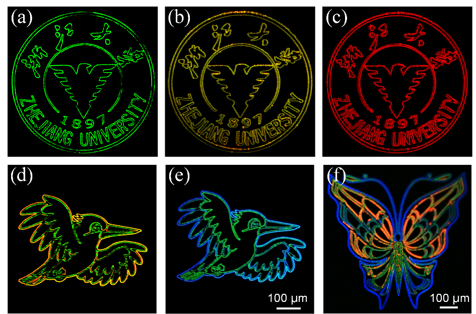 圖3(a)~(c)在玻璃內部直寫不同顏色的浙江大學?;?,(d)~(f)納米晶彩色圖案直寫