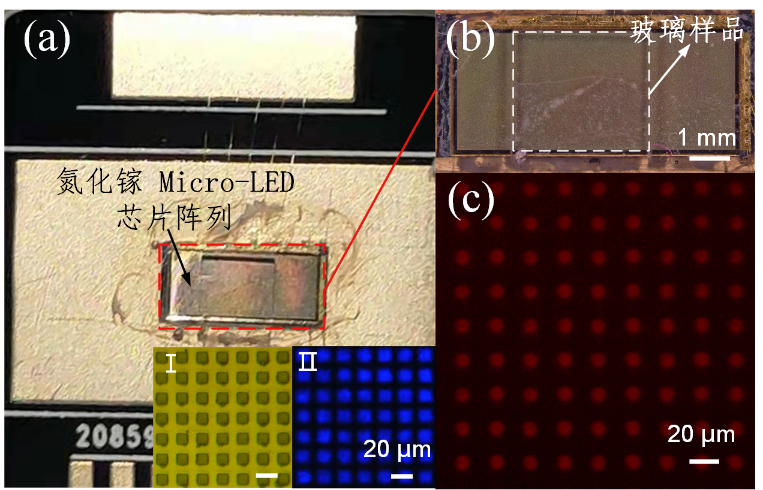 圖4(a)基于玻璃內部納米晶發光單元的micro-LED器件照片,插圖I:GaN micro-LED芯片陣列,插圖II:亮藍色發光mciro-LED芯片陣列;(b)圖(a)的放大圖;(d)玻璃內部在藍光激發下的紅色發光陣列照片